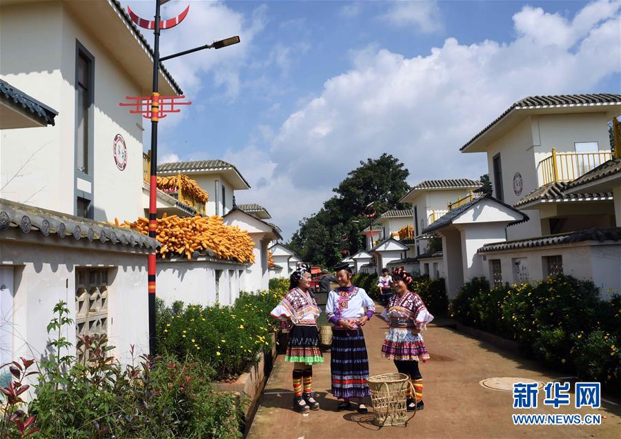 10月6日,在尋甸回族彝族自治縣塘子街道小海村,幾名婦女在新居前聊天。國(guó)慶節(jié)期間,云南省尋甸回族彝族自治縣塘子街道小海村一片喜慶祥和。人們身著節(jié)日盛裝,載歌載舞,歡慶搬入新居后的第一個(gè)國(guó)慶節(jié)。新華社記者楊宗友攝