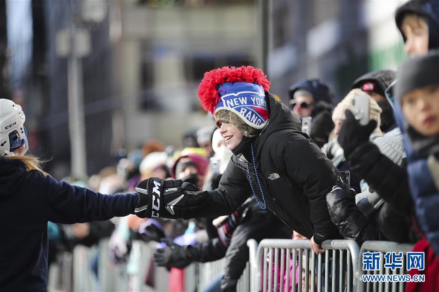 11月22日,在美國(guó)紐約感恩節(jié)大游行上,一名觀看游行的男孩與演員擊掌。