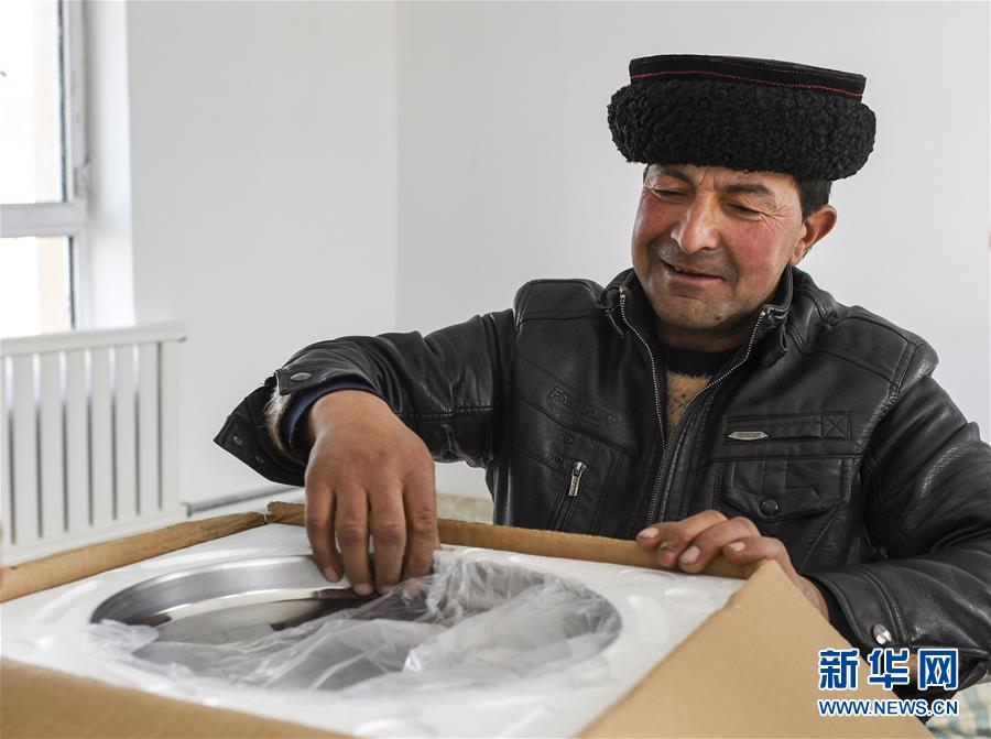 在塔什庫爾干塔吉克自治縣塔提庫力易地扶貧搬遷安置點的新房內,都熱·加爾曼領取免費發放的電飯鍋(11月18日攝)。新華社記者胡虎虎攝