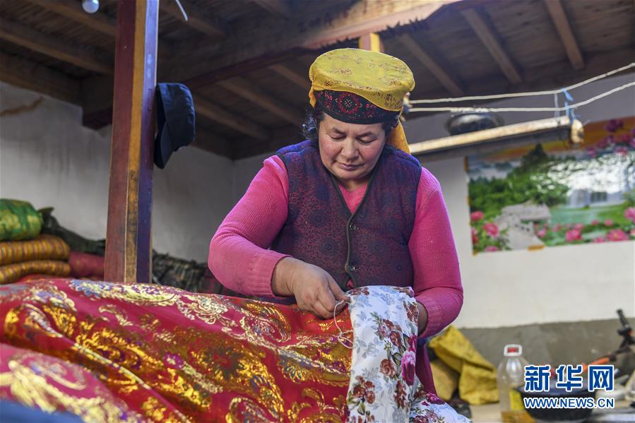 在塔什庫爾干塔吉克自治縣大同鄉阿克托尕欄桿村一組都熱的舊居中,都熱·加爾曼的妻子在縫制新被子,為搬遷新居做準備(11月13日攝)。新華社記者胡虎虎攝