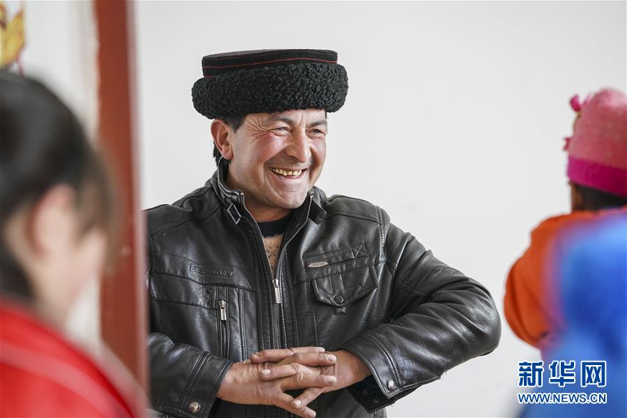 在塔什庫爾干塔吉克自治縣塔提庫力易地扶貧搬遷安置點的新房內,都熱·加爾曼與前來看望他的鄰居聊天(11月18日攝)。新華社記者胡虎虎攝