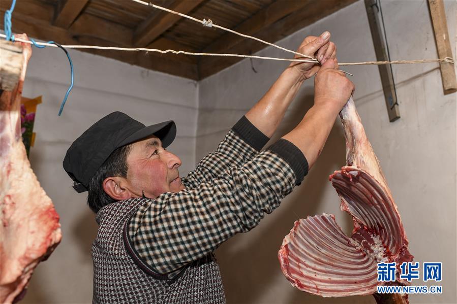 出發的前一天,都熱·加爾曼把分割好的羊肉掛在家中,這是他特意為暫時留守在家中的妻子和老人準備的(11月16日攝)。新華社記者胡虎虎攝
