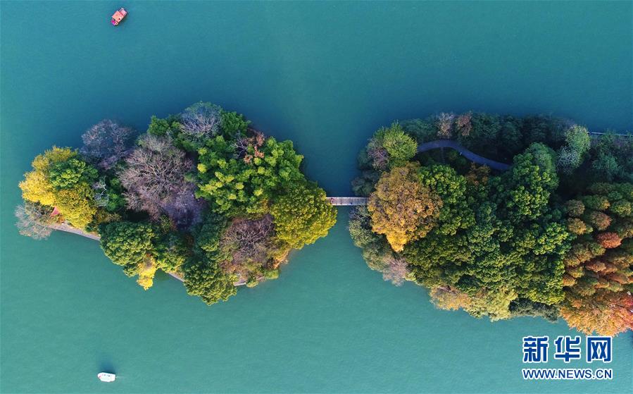 兩只小船行駛在湖南烈士公園年嘉湖湖面(11月25日無人機拍攝)。 新華社記者 李尕攝