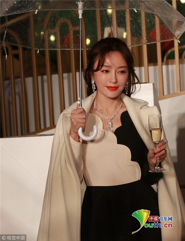 秦嵐撐傘雪膚紅唇美如畫 優雅品香檳 ...