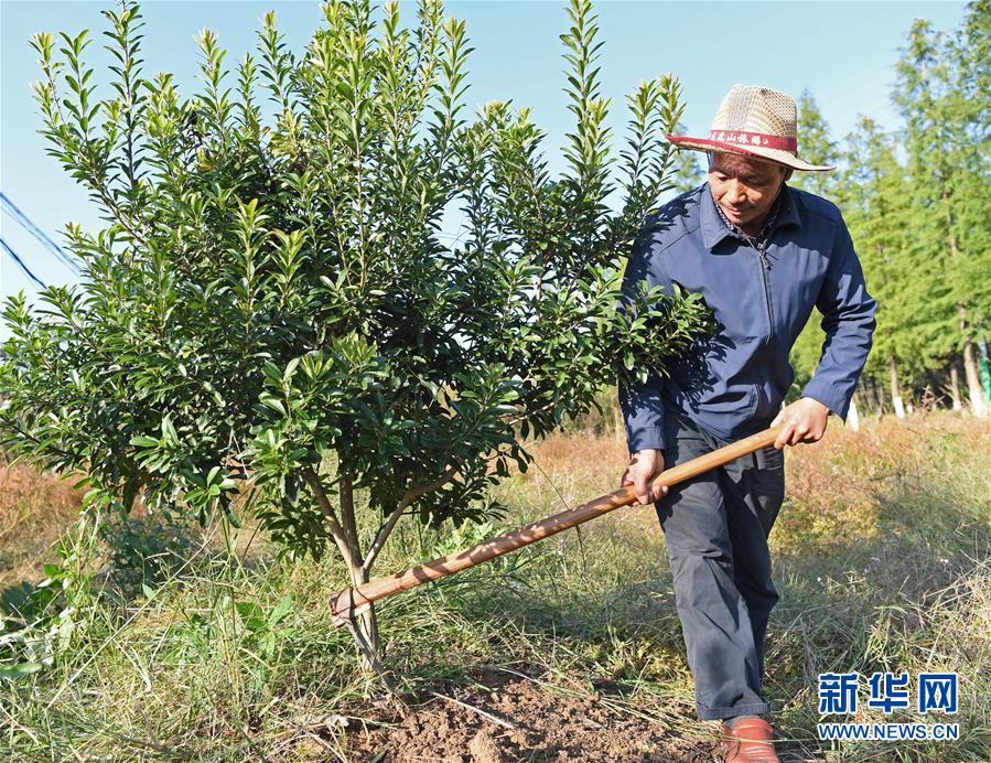 舒港發在自家田地給楊梅樹除草(10月27日攝)。