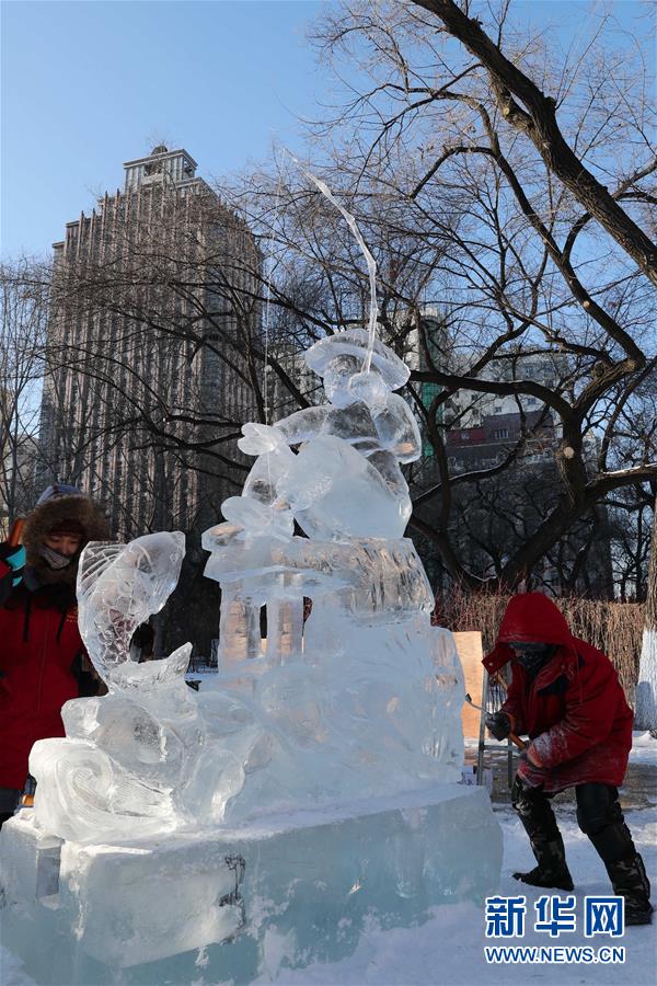 12月27日,選手們在比賽中完善冰雕作品。 當日,第十六屆黑龍江省大學生冰雕藝術設計創作大賽在哈爾濱兆麟公園落下帷幕,全省高校共有99支隊伍參賽。 新華社記者曹霽陽攝