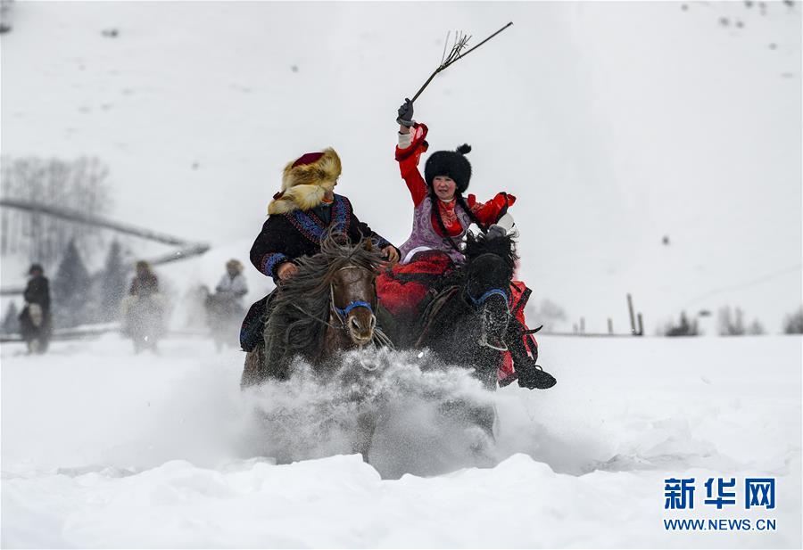 1月1日,在新疆禾木雪鄉,當地居民表演“雪地姑娘追”。