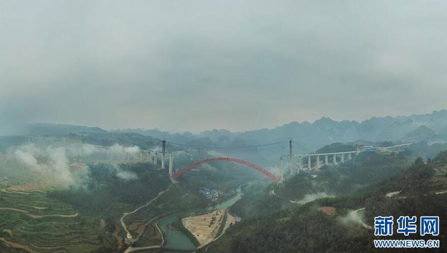 1月7日無人機航拍的平塘特大橋橋塔全景,中為高332米的世界第一高混凝土橋塔。