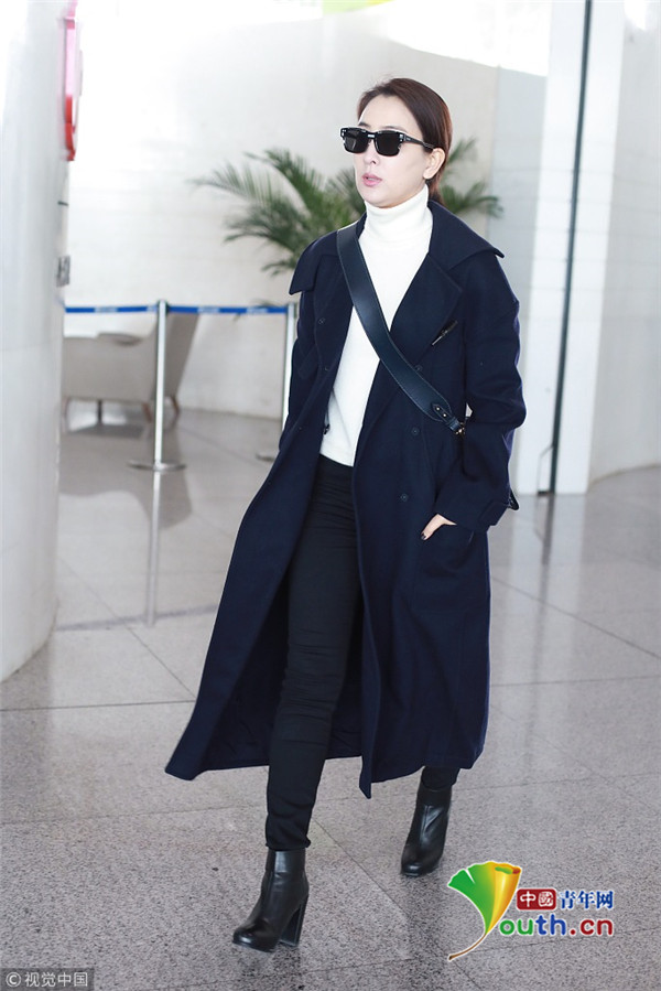 2019年1月7日,北京,馬蘇現身機場。她身穿黑色到腳大衣霸氣外露,架黑超涂紅唇似帥氣“女特工”。