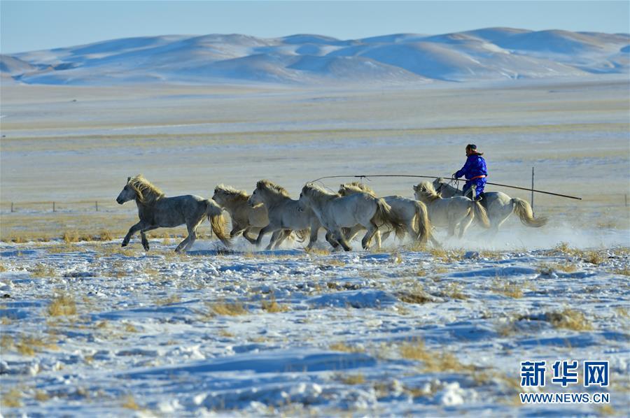 1月8日,牧民進(jìn)行套馬表演。 時(shí)下正值草原冬季旅游旺季,內(nèi)蒙古自治區(qū)西烏珠穆沁旗的牧民們?cè)谘┰弦徽股硎郑瑸橛慰驼宫F(xiàn)獨(dú)特的民族風(fēng)情。 新華社記者 鄒予 攝