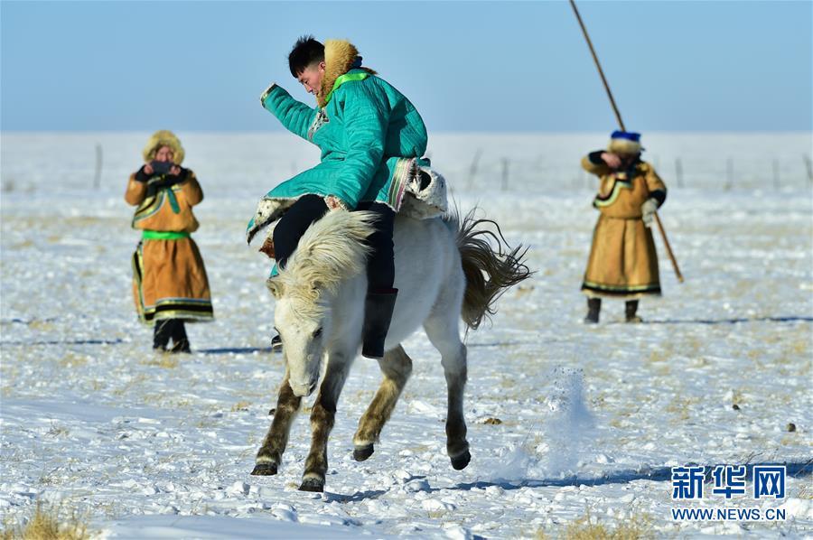 1月8日,牧民在馴服一匹烈馬。 時下正值草原冬季旅游旺季,內蒙古自治區西烏珠穆沁旗的牧民們在雪原上一展身手,為游客展現獨特的民族風情。 新華社記者 鄒予 攝