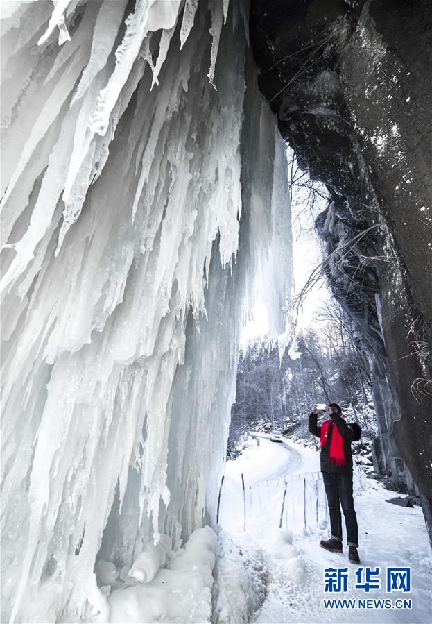 游人在吉林省長白縣十五道溝望天鵝景區內拍攝冰瀑景觀(1月3日攝)。新華社記者許暢攝