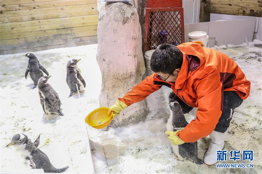 1月9日,馴養員給白眉企鵝寶寶喂食。 新華社記者 潘昱龍 攝