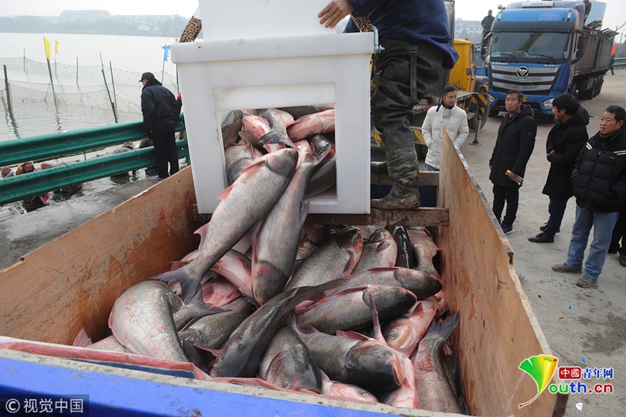 八里河冬捕與其他地方的捕魚方式不同,漁民們提前一個月的時間駕駛小船,自東向西驅逐魚群,漸漸地會把近兩萬畝水面的魚群都聚攏到碼頭附近一百多畝用圍網柵起來的區域。據當地漁場負責人介紹“為了賣出好價格,今年與往年一樣,先根據市場行情確定底價,然后通過招投標方式確定銷售商?!苯衲辏瑸榱宋嗟娜藗儊戆死锖訁⑴c冬捕活動,八里河漁場在活動當天會拿出3萬斤鮮魚供市民選購。