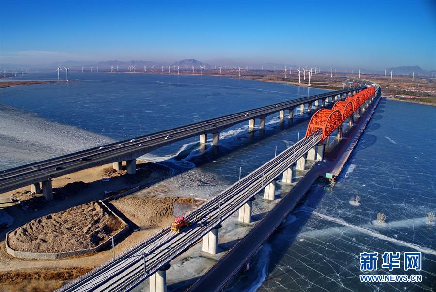 1月13日,中鐵三局的工人在京張高鐵官廳水庫特大橋進行鋪軌作業(無人機拍攝)。 新華社記者 楊世堯 攝