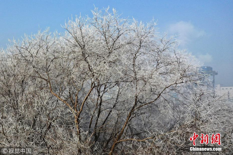 1月13日,霧散日升。河北省邢臺市大街小巷的樹枝上掛滿了潔白晶瑩的霜花,藍(lán)天下微風(fēng)吹拂銀絲閃爍,奇麗壯觀。給臘八節(jié)日增添了亮麗的風(fēng)景。霍紅軍 攝 圖片來源:視覺中國