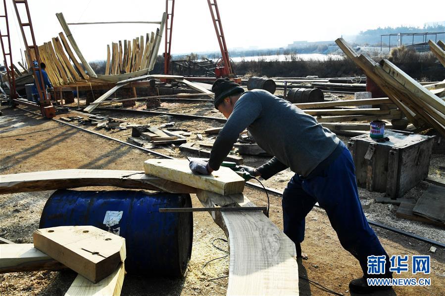 在青島紅雙木造船廠,一位造船師傅在加工構件(1月10日攝)。新華社記者 李紫恒 攝