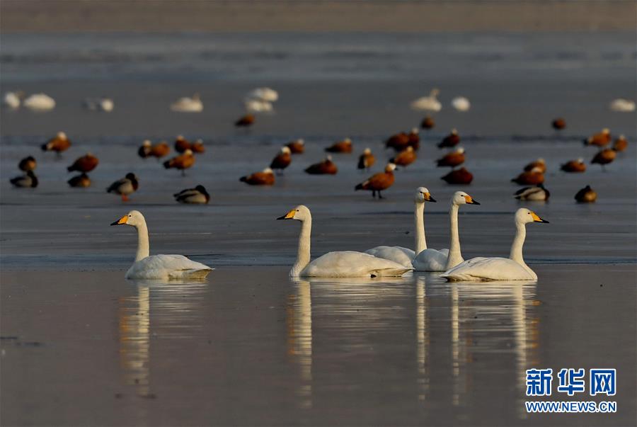 1月13日,天鵝等水鳥在張家口市宣化區洋河水庫休憩。 近年來,河北省張家口市宣化區立足京津冀生態涵養區的功能定位,不斷加大環境治理和生態功能修復力度,使洋河水庫及周邊濕地成為天鵝、大雁、野鴨、灰鶴等多種鳥類南北遷徙中的棲息地。 新華社記者楊世堯攝