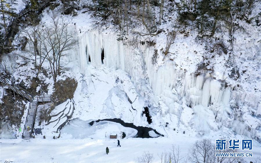 游人在吉林省長白縣十五道溝望天鵝景區觀賞冰瀑景觀(1月3日無人機拍攝)。新華社記者許暢攝