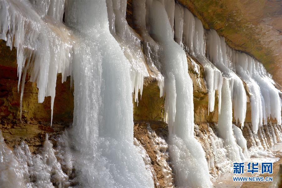 黑老鍋景區位于甘肅省慶陽市顯勝鄉,峽谷長千余米,每年冬季泉水結成冰瀑,景色壯觀,吸引眾多游客前來游玩。 新華社記者李笑攝
