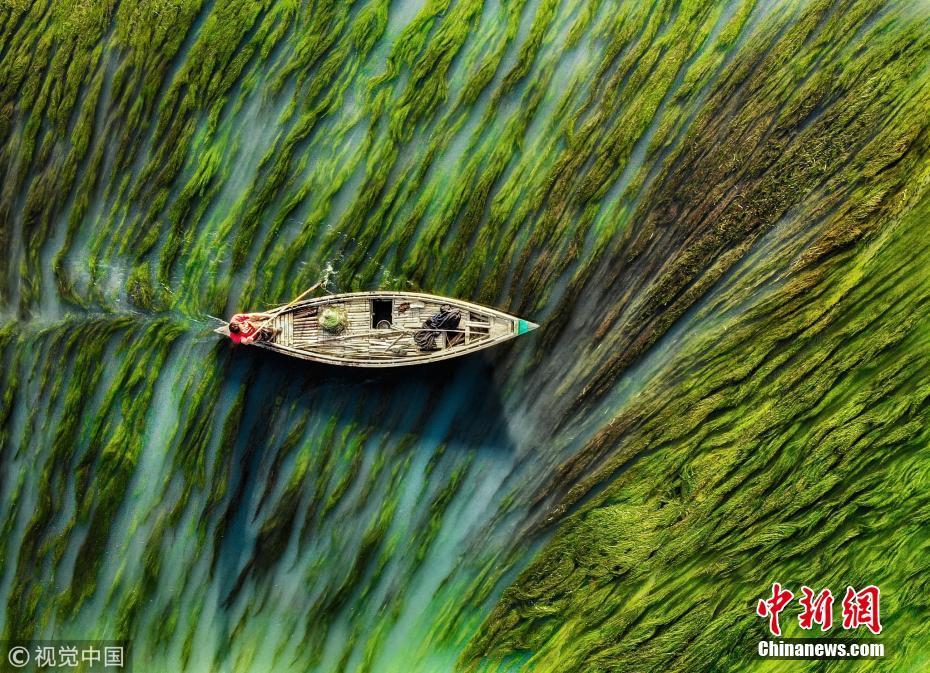 中國新聞網1月14日訊(具體拍攝時間不詳),孟加拉國烏拉帕拉,漁船在水流和藻類的映襯下前行,畫面看起來就像水彩畫一般。圖片來源:視覺中國