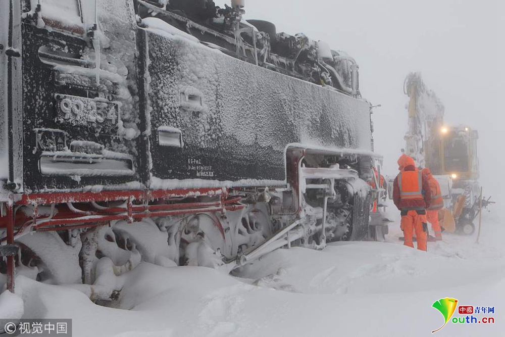 當地時間2019年1月9日,德國錫爾克,一輛蒸汽火車被大雪困住無法前進。