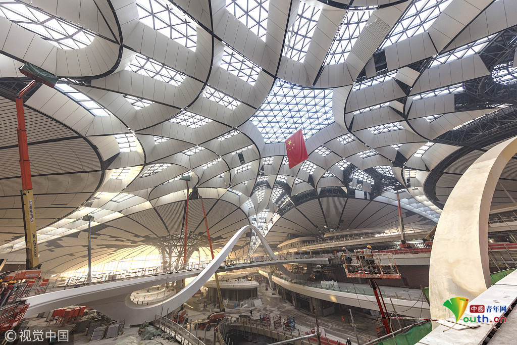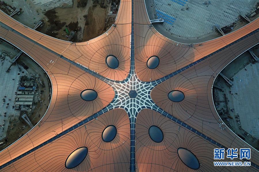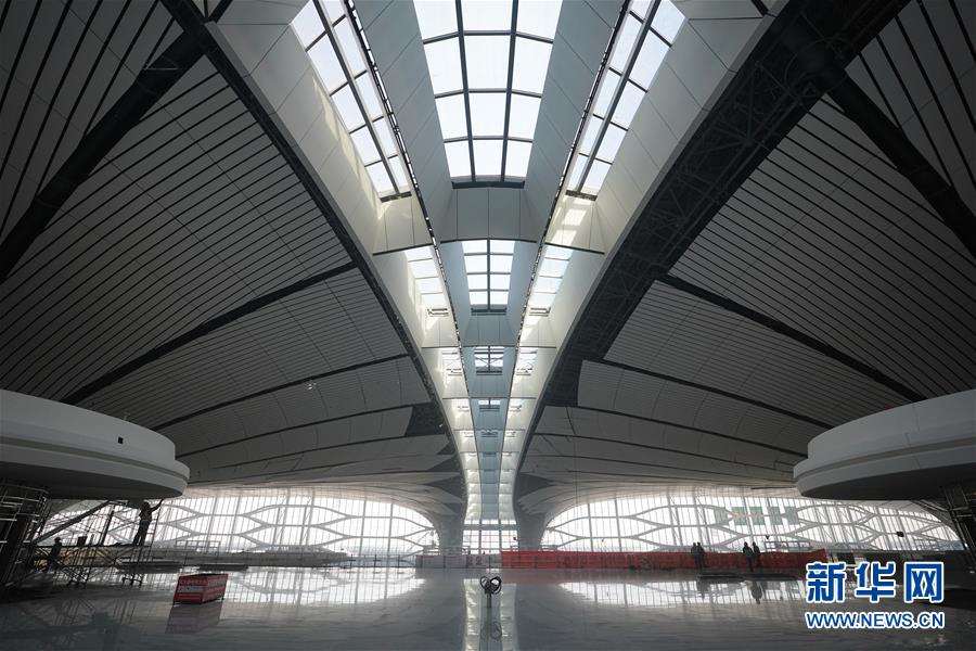 2018年12月19日,北京大興國際機場航站樓的屋面已基本完工,一只金色“鳳凰”完整地出現在北京城南。航站樓的室內裝修在有條不紊的推進中。