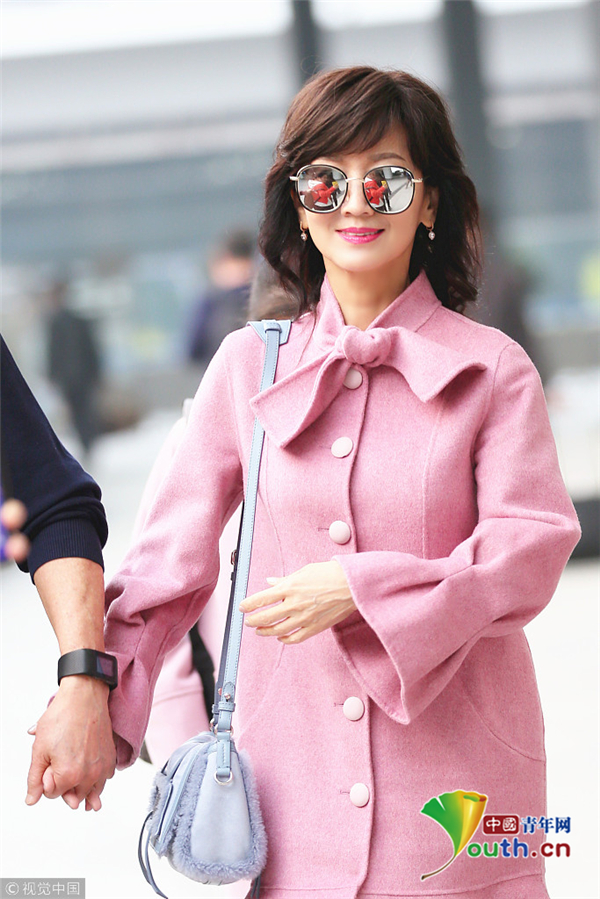 趙雅芝著粉嫩魚尾大衣優雅甜美 獲老公一路牽手