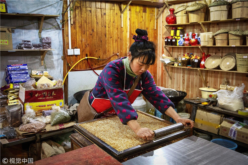 重慶江津區中山古鎮第十四屆 “千米長宴”民俗文化節盛大啟幕。上午10時,中山古鎮老街人聲鼎沸,窄窄的青石板路打掃得干干凈凈,家家戶戶門口掛起喜慶的紅燈籠,老商鋪門口擺滿了米酒、烤糍粑、煙熏豆腐……此次“千米長宴”以“絲路情緣,‘埃’上中山”為主題。“千米長宴”期間,游客們不僅可以一雙筷子吃遍全街,還可欣賞到祈福祭祀、民俗拜年、“打盆上菜”等表演,同時還增設了以唱、跳、講故事的上菜方式情景演繹愛情主題的文化餐飲,展示富硒愛情宴的文化內涵。圖為街坊們在頭天就開始準備各種菜肴與小吃。