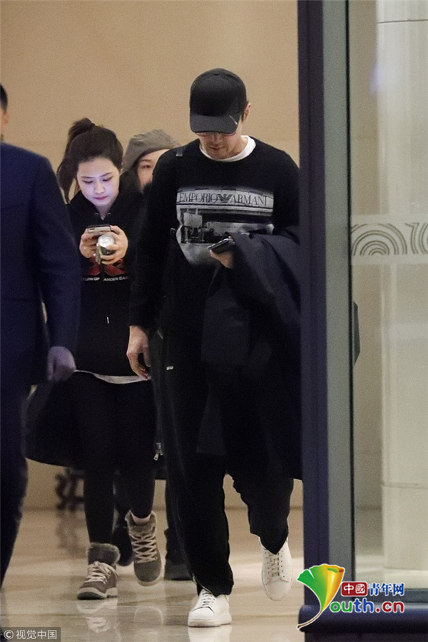 2019年2月25日,北京,胡歌現身機場。他身穿全黑套裝現身機場力求低調,一路低頭疾步前行,兩條長腿吸睛。