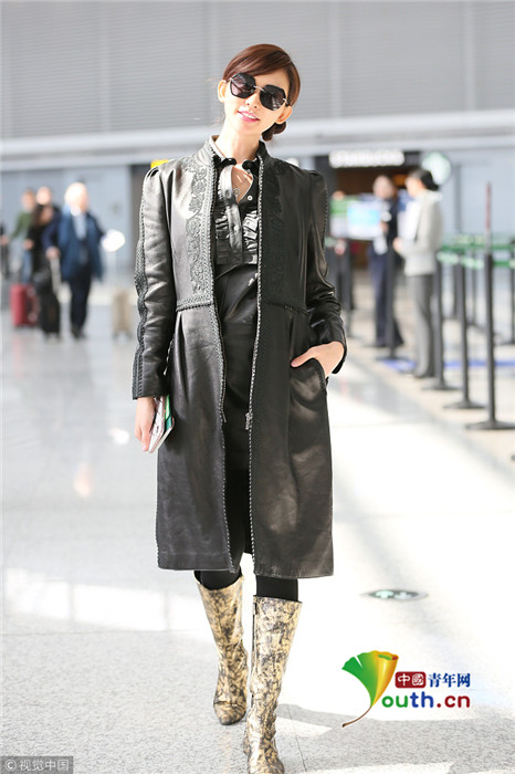 林志玲近日現身虹橋機場,黑超遮面的她身著黑色皮風衣,挎著大牌包十足御姐范,一路大方任拍,相當親和!