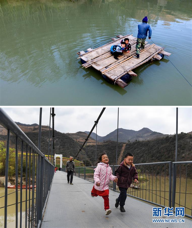 這是一張拼版照片:上圖為略陽縣徐家坪鎮藥木院村江口壩組的余皓軒(左)、劉紫涵(中),由余皓軒的外公劉德安撐上簡易木筏,去對岸的幼兒園上學(2018年11月22日無人機拍攝);下圖為余皓軒(前右)、劉紫涵(前左)放學歸來,手拉手走在新修的鋼結構吊橋上(2019年3月25日攝)。