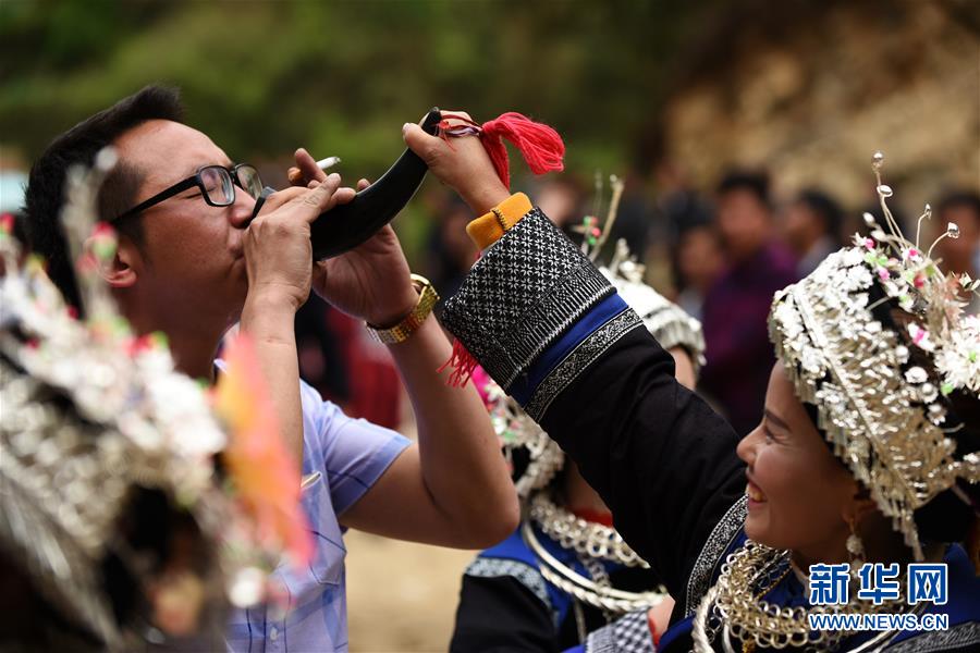 苗族群眾給來賓敬牛角酒(4月6日攝)。4月6日至7日,在貴州省黔東南苗族侗族自治州劍河縣觀么鎮新民村和新合村,來自劍河縣和三穗縣的苗族同胞歡聚一堂,通過民族歌舞展演、非遺手工藝展示、千戶祭“巫耶”、跳蘆笙舞等形式,與來賓一起歡慶2019年高雍苗族“三月三”民俗文化節。 新華社記者 楊文斌 攝