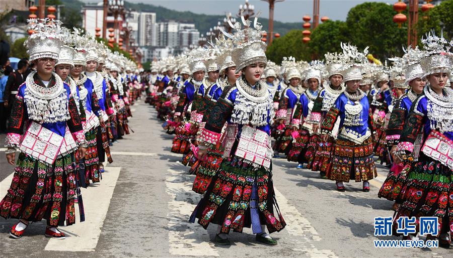 4月18日,臺江縣苗族群眾參加盛裝游演活動。 當日,貴州省黔東南苗族侗族自治州臺江縣迎來一年一度的苗族姊妹節。節日期間將舉行苗族盛裝游演、千人長桌宴、千人游方體驗、苗族手工創意大賽等一系列活動。 姊妹節是臺江縣苗族同胞的傳統節日,2006年被列入第一批國家級非物質文化遺產名錄。 新華社記者 楊文斌 攝