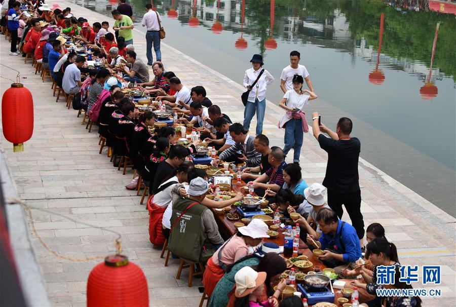 4月18日,游客在臺江縣參加苗族姊妹節長桌宴體驗活動。 當日,貴州省黔東南苗族侗族自治州臺江縣迎來一年一度的苗族姊妹節。節日期間將舉行苗族盛裝游演、千人長桌宴、千人游方體驗、苗族手工創意大賽等一系列活動。 姊妹節是臺江縣苗族同胞的傳統節日,2006年被列入第一批國家級非物質文化遺產名錄。 新華社記者 楊文斌 攝