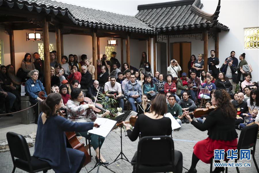2018年2月24日,人們在美國紐約大都會博物館“明軒”欣賞演出,慶祝新春佳節(jié)。中式庭院“明軒”是中國第一個落戶海外的蘇式園林,位于美國紐約大都會博物館二層的玻璃天棚下,是模仿中國蘇州網(wǎng)師園中的“殿春簃”設(shè)計建造而成的。“明軒”由蘇州市園林管理局承建,所用的磚、瓦、木材、構(gòu)件等在中國備好后,由20余名中國工程師和工匠在美國組裝。 新華社記者王迎攝