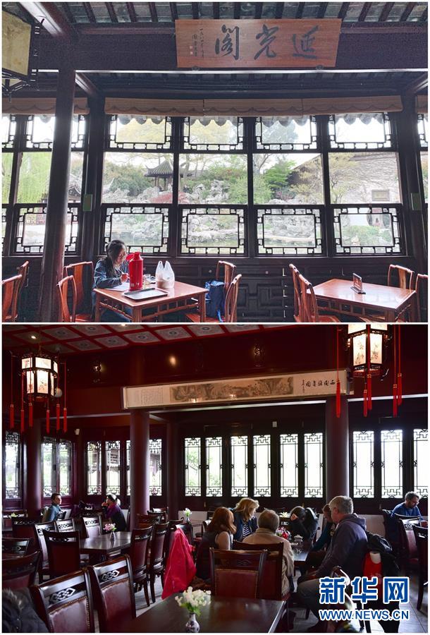 這張拼版照片展示的是:上圖,2019年4月2日,在中國蘇州藝圃,一名女子在延光閣內學習(新華社記者杜涓涓攝);下圖,2019年4月13日,游客在德國曼海姆中式園林“多景園”內的“多景樓”飲茶休憩(新華社記者逯陽攝)。