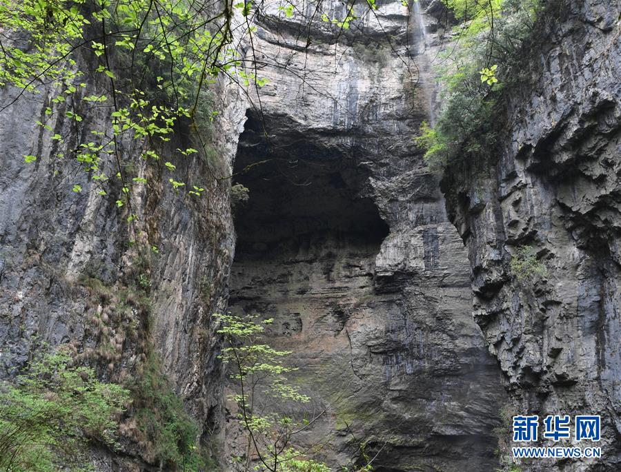 地洞河天坑的巖壁(4月22日攝)。位于陜西省漢中市寧強縣的地洞河天坑,是禪家?guī)r天坑群中規(guī)模最大的一處天坑,坑內分布有石鐘乳、石筍,具有極高的地質研究價值。 新華社記者 張博文 攝