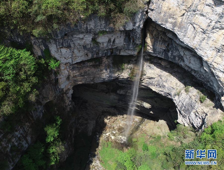 這是4月22日在陜西省漢中市寧強縣火石子村用無人機拍攝的地洞河天坑內的一處瀑布。位于陜西省漢中市寧強縣的地洞河天坑,是禪家巖天坑群中規模最大的一處天坑,坑內分布有石鐘乳、石筍,具有極高的地質研究價值。 新華社記者 張博文 攝