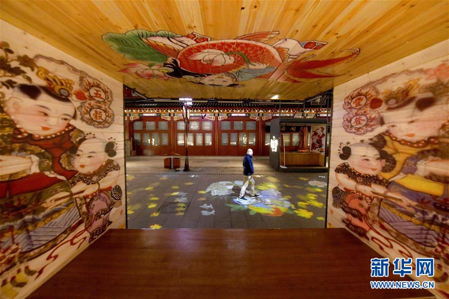 12月4日,一名游客走在布滿楊柳青年畫主題燈光的步行街上。 近日,天津市西青區楊柳青古鎮在步行街新增9組以楊柳青年畫代表作為主題的動態夜景燈光,講述古鎮與年畫的歷史。 新華社記者 岳月偉 攝
