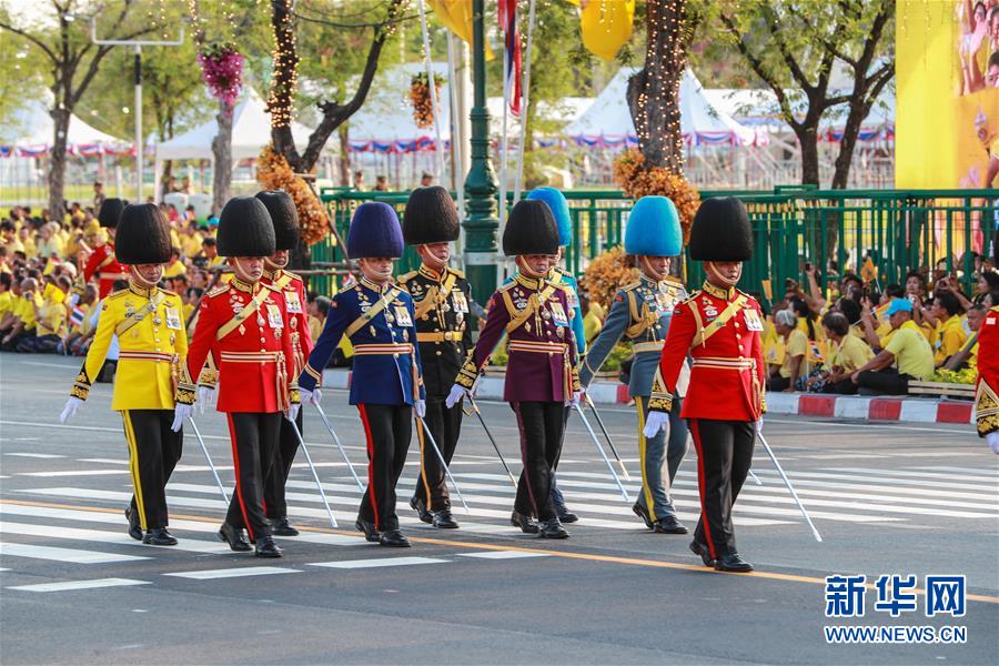 5月5日,儀仗隊在曼谷大王宮附近舉行的泰國國王加冕典禮巡游上列隊前進。  新華社發(拉亨攝)