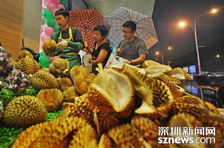 2017年6月5日夜里,武漢一家水果店正進行金枕榴蓮打折促銷,門前堆積如山的榴蓮殼頗為壯觀,不少市民聞著榴蓮散發的濃郁味道前來排隊選購,雨夜里食客們依舊絡繹不絕。