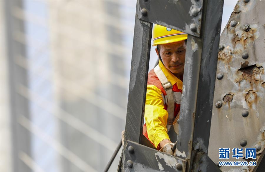 中國鐵路成都局有限公司重慶工務(wù)段53歲的橋隧工唐金華在白沙沱長江大橋的鋼架上檢查鋼梁的銹蝕情況(4月23日攝)。 4月23日下午5點(diǎn)40分,隨著重慶白沙沱長江大橋通行的最后一列客運(yùn)列車順利通過,這座“服役”了59年的重慶首座長江大橋進(jìn)入“退役”倒計(jì)時。4月24日后,所有列車將改線經(jīng)距白沙沱長江大橋約100米的新白沙沱長江特大橋通行,新橋“接力”老橋,運(yùn)輸能力將得到大幅提升。 白沙沱長江大橋于1958年開工,1960年通過首趟列車,是繼武漢長江大橋之后的第二座長江大橋。 新華社記者 劉潺 攝
