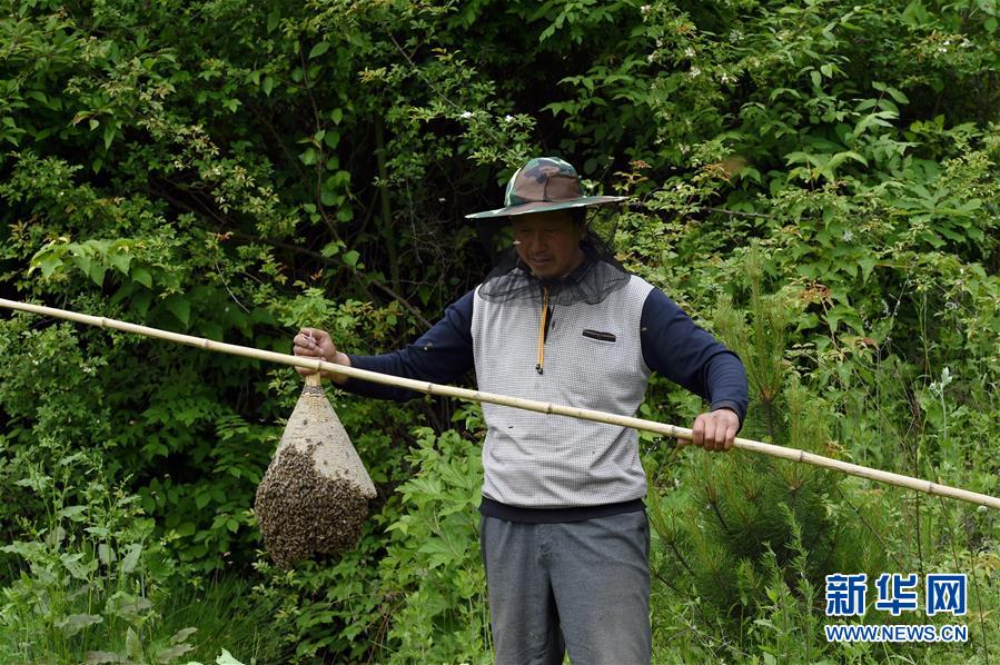 5月10日,在甘肅省隴南市徽縣大河店鎮硬灣村,蜂農周仲頤在收蜂。 甘肅省隴南市徽縣大河店鎮硬灣村位于秦巴山區深處,2017年,在當地政府的扶持下,龍崖老巢蜜養殖農民專業合作社成立,蜂農們將傳統養蜂技藝和現代加工方式相結合,并通過電商等渠道打開銷路,有效帶動了當地貧困村民脫貧致富。目前整個合作社共有蜂箱2000余個,每箱每年可帶來三四千元的收入。 新華社記者 馬寧 攝