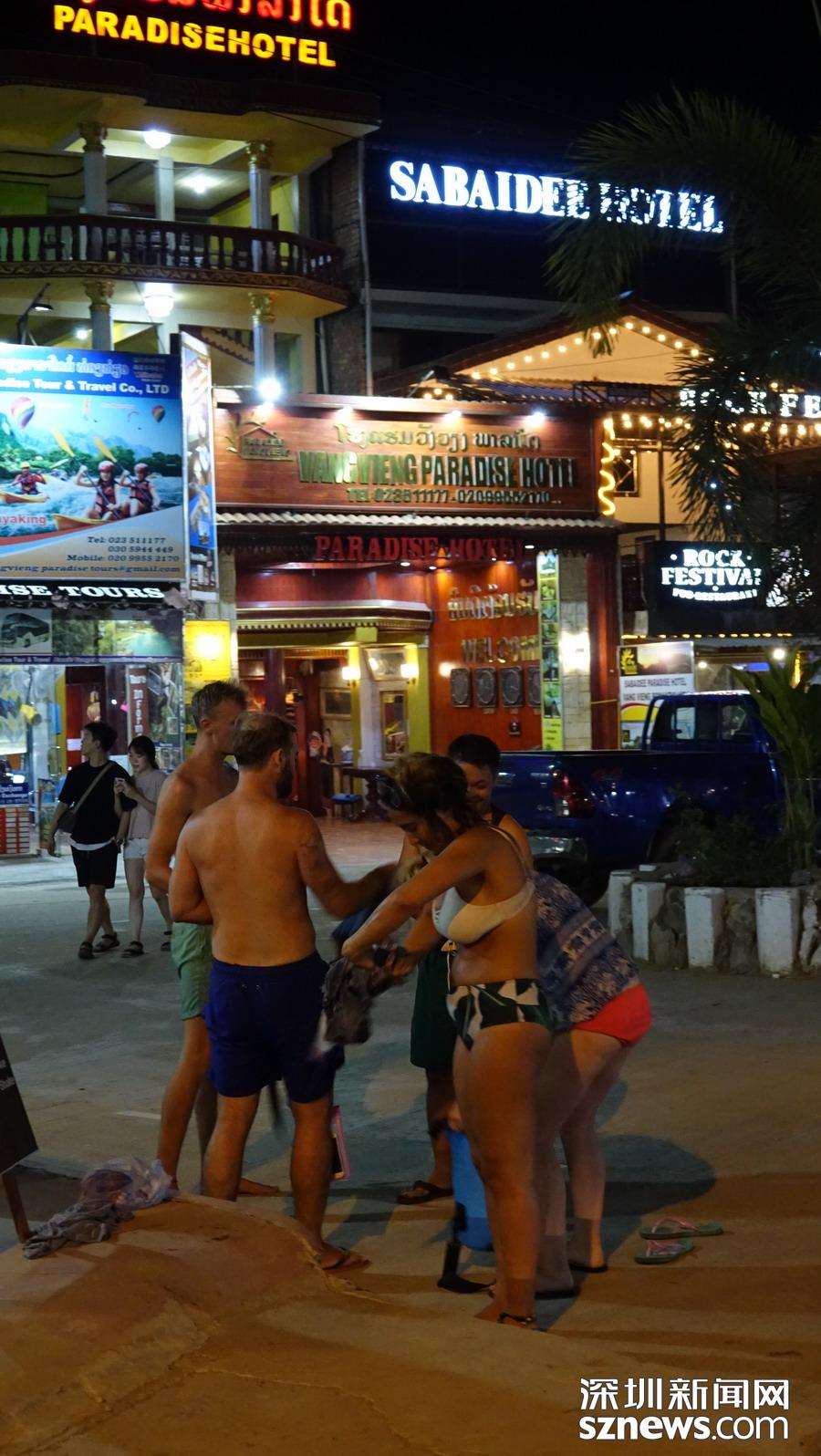 萬榮的開放程度很高。夜晚,南松河畔、街道兩旁都是酒吧,常常可以看到漂流回來身著泳裝的“老外”當街站立。李仁奇 攝