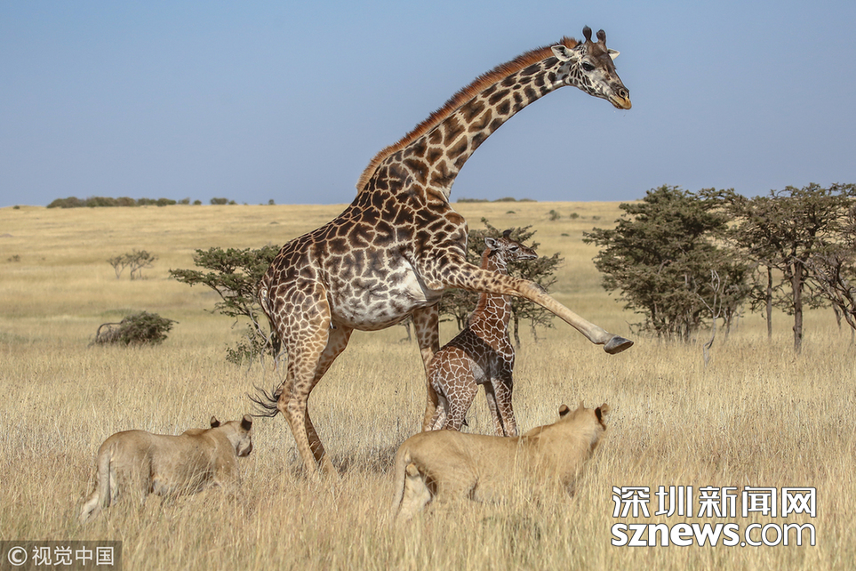 深圳新聞網訊 當地時間2018年8月15日,肯尼亞馬賽馬拉,當地導游詹姆斯·納帕索(James Nampaso)拍攝到一群獅子圍攻母長頸鹿和她的幼崽。盡管長頸鹿勇敢地抵抗獅群的進攻,但當一頭母獅跳上它的脊背時,它被分散了注意力,使得獅群最終捕獲了它的孩子。