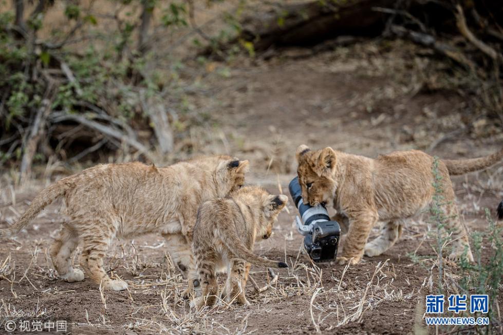 近日,非洲博茨瓦納馬沙圖野生動物保護區內一頭獅子叼起攝影師掉落在地上的相機,之后還將相機交給小獅子們玩耍,看起來十分好奇,而攝影師非常無奈。現年57歲的叢林探險家Barbara Jensen Vorster在一輛越野車上為馬沙圖野生動物保護區的獅群拍照時,相機不小心掉到了地上。砰的一聲響驚動了母獅子,它向攝影師方向移動,迫使探險隊撤退。(圖片來源:視覺中國)