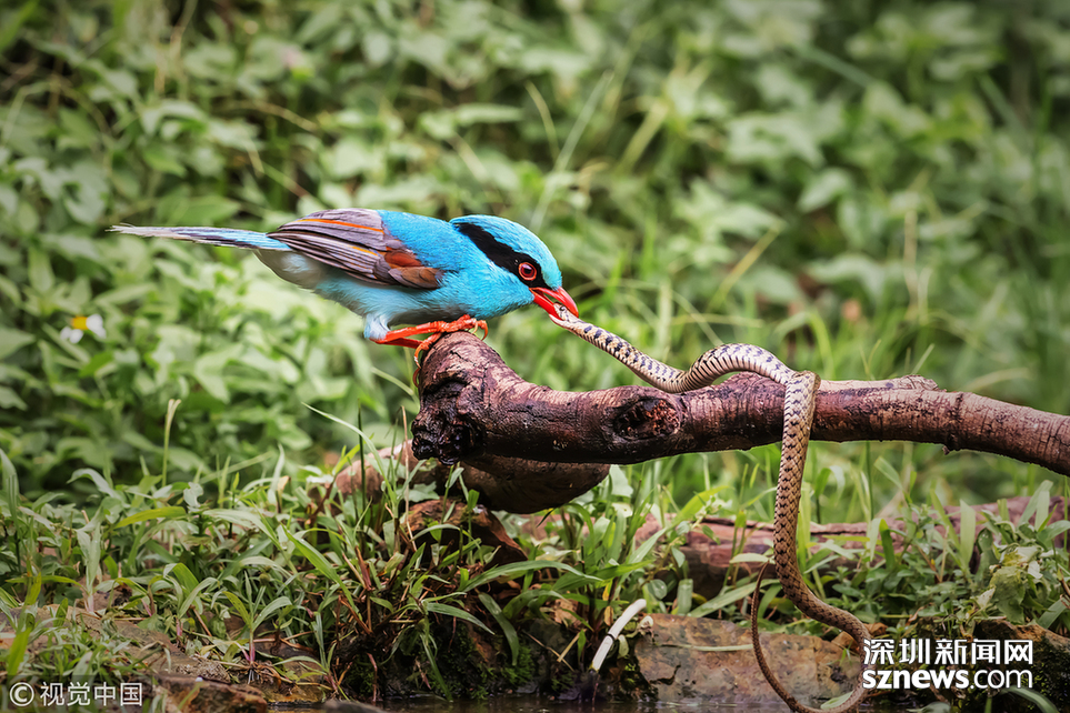 2018年7月18日,廣東東莞,藍綠鵲與蛇的地盤爭斗。
