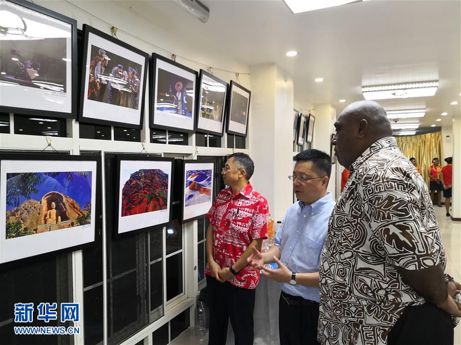 5月29日,在斐濟蘇瓦,中國駐斐濟大使錢波(中)與斐濟中國文化中心主任鄧先富(左)陪同嘉賓觀看展出的精美圖片。 為期5天的中國旅游文化周及美食節活動29日晚在斐濟首都蘇瓦拉開帷幕,來自中斐兩國的約200名嘉賓出席了開幕式。開幕式上,嘉賓們觀看了反映中國寧夏自然風光和人文風貌的精美圖片以及中國非物質文化遺產展,來自寧夏的藝術家表演了精彩文藝節目,來自江蘇的大廚為嘉賓帶來了淮揚菜。 新華社記者 張永興 攝