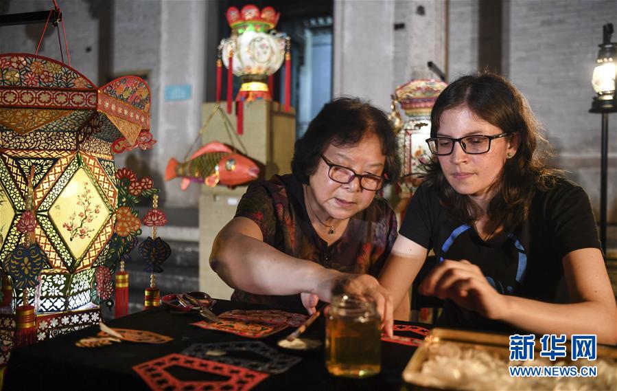 國家級非遺傳承人楊玉榕(左)在古驛道陳芳家宅外廣場指導(dǎo)外國留學(xué)生制作彩燈(5月31日攝)。